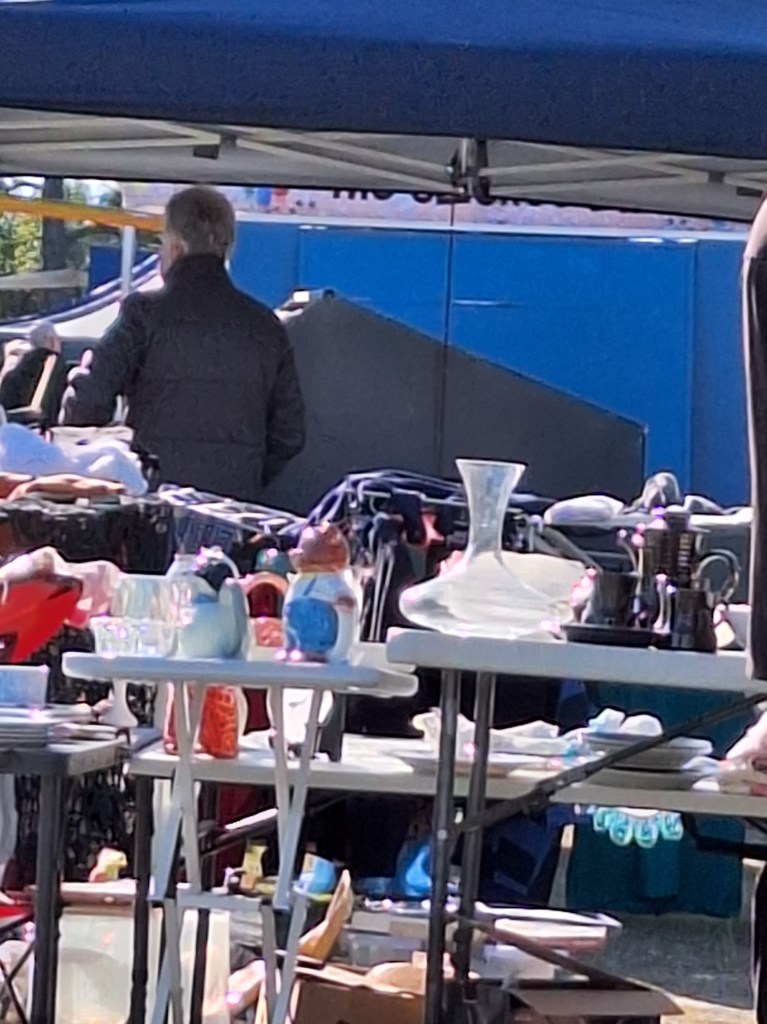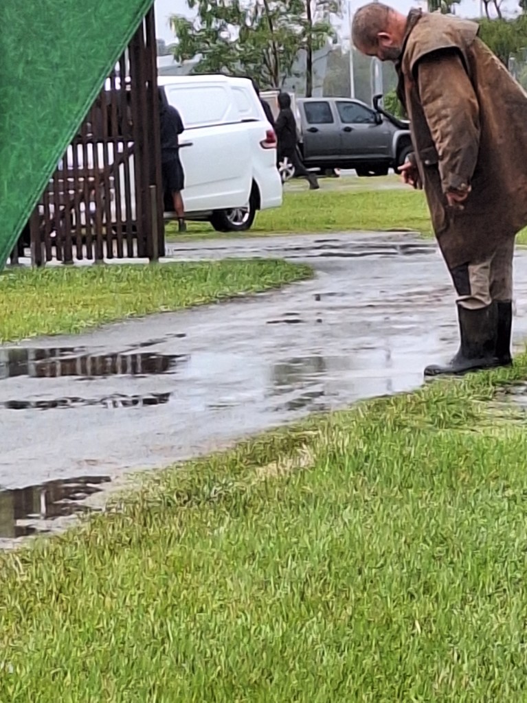 Lindsay trying to drain puddles at Fishermans Road Markets by making a small drain trench with the heel of his boot checking his success.